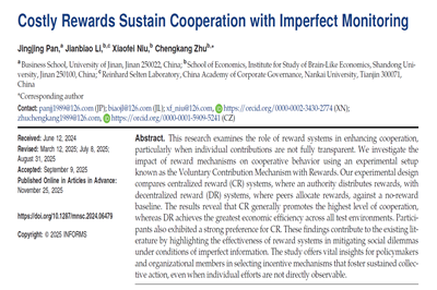 近日,济南大学商学院教师潘晶晶与山东大学李建标教授等合作的题为《Costly Rewards Sustain Cooperation with Imperfect Monitoring》的研究论文,在管理学领域国际顶级期刊Management Science在线发表。潘晶晶博士为论文第一作者,济南大学为第一单位。