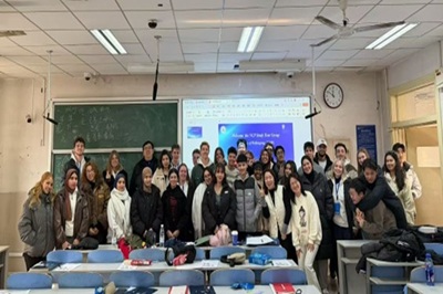 汉语学习与学子交流成为此次活动的重要环节。商学院谢老师为UOW学生授课,以基础发音、常用词汇等方式结合生活场景教学,引导学生感受汉语魅力。课后,UOW学生与商学院全英文国贸班留学生展开交流,分享学习与文化经历,在双语互动中深化友谊。同时,黄泰然教授在我院进行现场宣讲,介绍沃隆港大学学术特色及合作项目,为中外学术交流搭建平台;在后续互动环节,中外学子通过合唱、团队游戏等形式进一步增进情感,为后续合作奠定坚实基础。